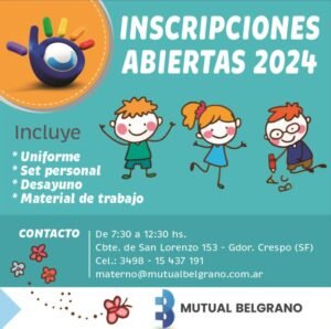 Desde la Institución Educativa se informa que se encuentra abierta la inscripción al Ciclo Lectivo 2024 en el Materno Mutual Belgrano. Recordemos que en sus salas alberga niños desde los 90 días a los 3 años inclusive, divididos naturalmente por edades y en un ambiente cómodo, adecuado a tal fin y con personal idóneo. Con la inscripción cada niño recibe su uniforme, set personal, desayuno y material de trabajo. Las actividades especiales que desarrollan son: Arte, Música, Educación Física, Área de Estimulación, Inglés y Terapia Ocupacional. Además de talleres como el de cocina, huerta, taller literario, expresión corporal y celebración de los cumpleaños de los niños. Las salas y los ambientes son cómodos, con todo el material didáctico necesario, climatizados y también se cuenta con espacios al aire libre y seguridad mediante el monitoreo con un circuito cerrado de cámaras de seguridad. El Materno permanece abierto durante todo el año de 7:30 a 12:30 horas y los interesados pueden consultar en Combate de San Lorenzo 153 Gobernador Crespo o al correo materno@mutualbelgrano.com.ar para más información.