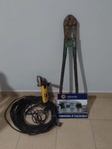 A raíz de la denuncia formulada por un alvañil de este medio quien diera cuenta que autor/es de identidad ignoradas sustrajeron desde una obra en construcción CABLE TIPO PROLONGACION COLOR NEGRO DE 50MTS APROXIMADAMENTE, UNA MOLADORA, TIJERA CORTADORA DE HIERRO DE COLOR VERDE Y TENAZA CABO COLOR NARANJA, de diligencias investigativas efectuadas por funcionarios policiales de ese medio, establecen que no seria ajeno al ilícito un joven mayor de edad, domiciliado en ese medio a quien se le secuestro los elementos denunciados como sustraídos . Interviene fiscal en turno quien ordeno diligencias a seguir. –
