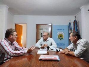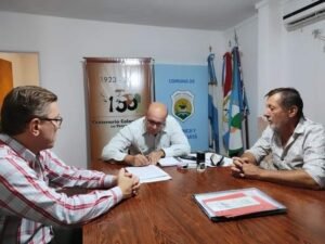 «El Presidente Comunal de La Penca y Caraguatá, Efren Cancian y el Director de Vialidad Provincial, Héctor Rossi, firmaron un convenio para que Vialidad realice la colocación de nuevas luminarias en la ruta 39, trayecto urbano de La Penca.»