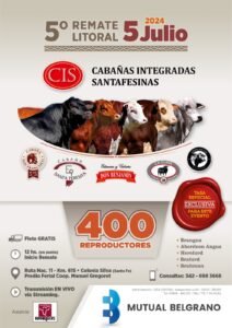 Ya nos estamos preparando para lo que será el 5º Remate Litoral de Cabañas Integradas Santafesinas este próximo viernes 5 de julio. Como ya es costumbre tendremos 400 reproductores (machos y hembras) de las razas Brangus, Aberdeen Angus, Hereford, Braford y Brahman de excelente calidad y la financiación exclusiva, con tasa especial para el evento, de Mutual Belgrano.