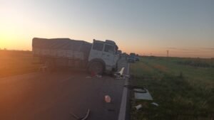 Por el fuerte siniestro el vehículo salió despedido y terminó sobre la banquina, mientras que el camión quedó ocupando los dos carriles