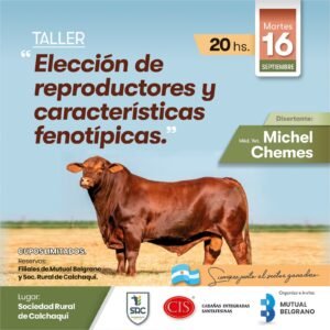 Taller “Elección de Reproductores y Características Fenotípicas” a cargo del Médico Veterinario Michel Chemes. El encuentro está organizado para el día martes 16 de septiembre en el SUM de la Sociedad Rural de Calchaquí, enmarcado dentro de las actividades que venimos desarrollando destinadas al sector Ganadero.