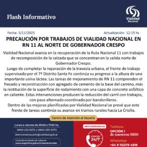 Vialidad Nacional avanza en la recuperación de la Ruta Nacional 11 con trabajos de recomposición de la calzada que se concentran en la salida norte de Gobernador Crespo. Luego de completar la reparación de la travesía urbana, el frente de trabajo supervisado por el 7º Distrito Santa Fe continúa su progreso a la altura de …